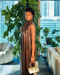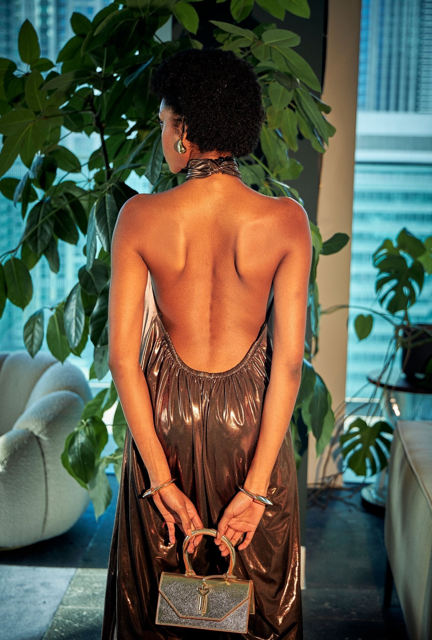 Elevate your style with the Bronze Metallic Wide-Leg Halter Neck Jumpsuit, a striking blend of modern design and timeless glamour. Crafted from shimmering metallic fabric, this jumpsuit catches the light beautifully, creating an effortlessly bold statement.