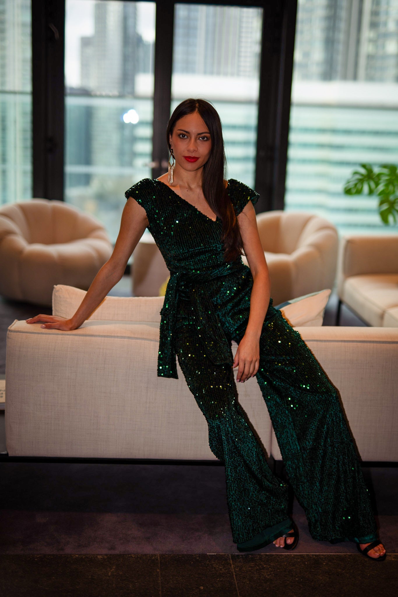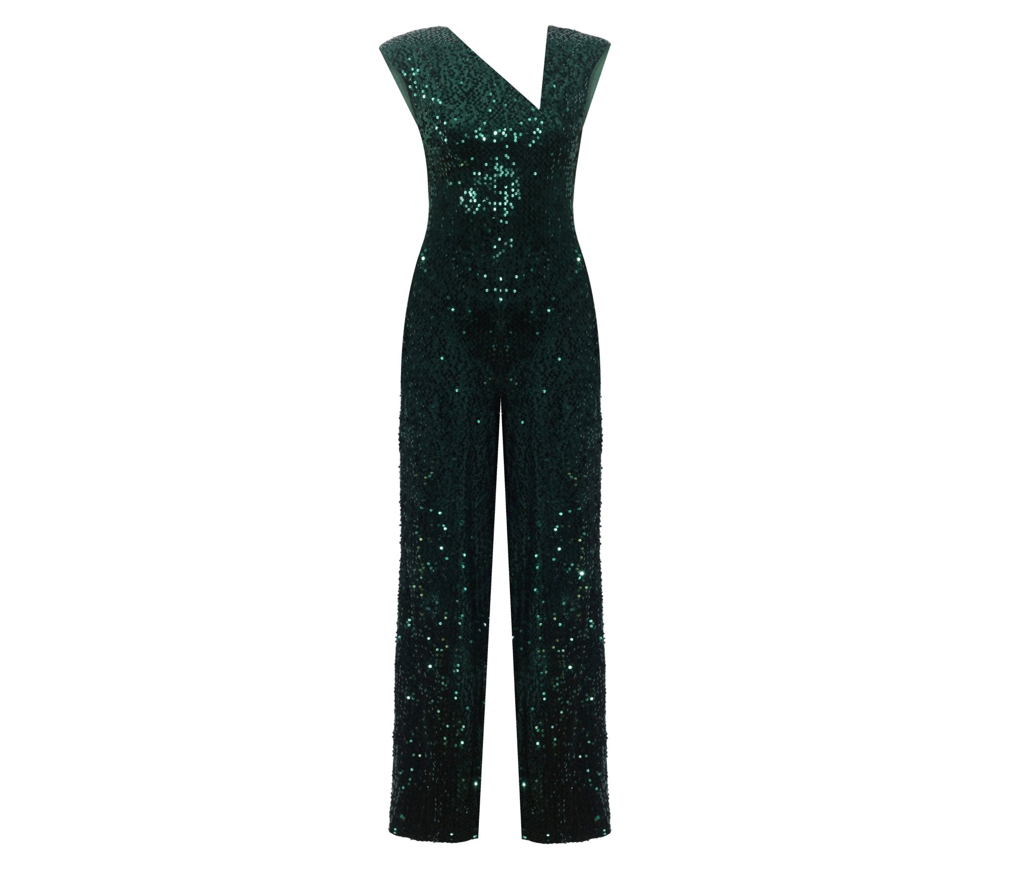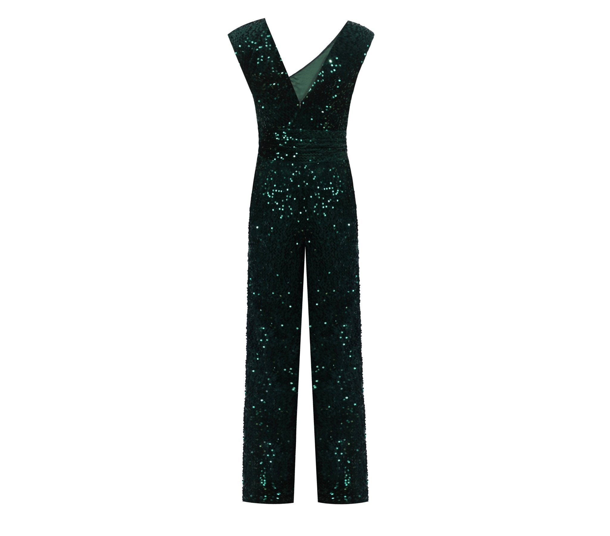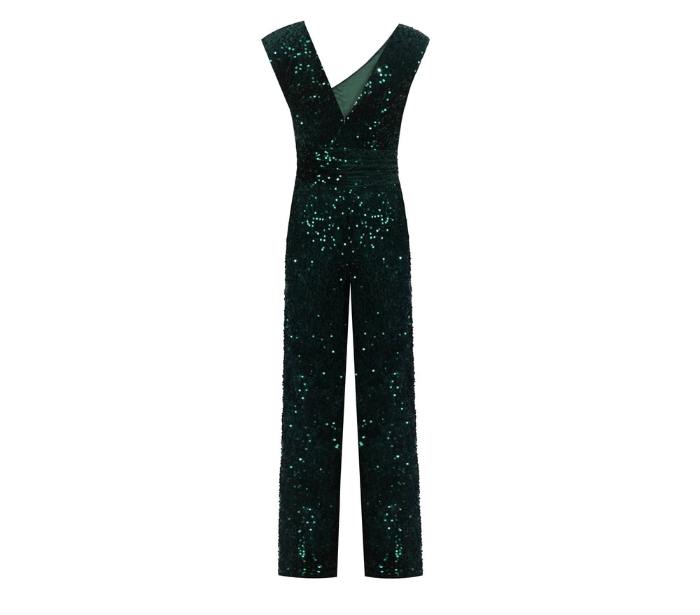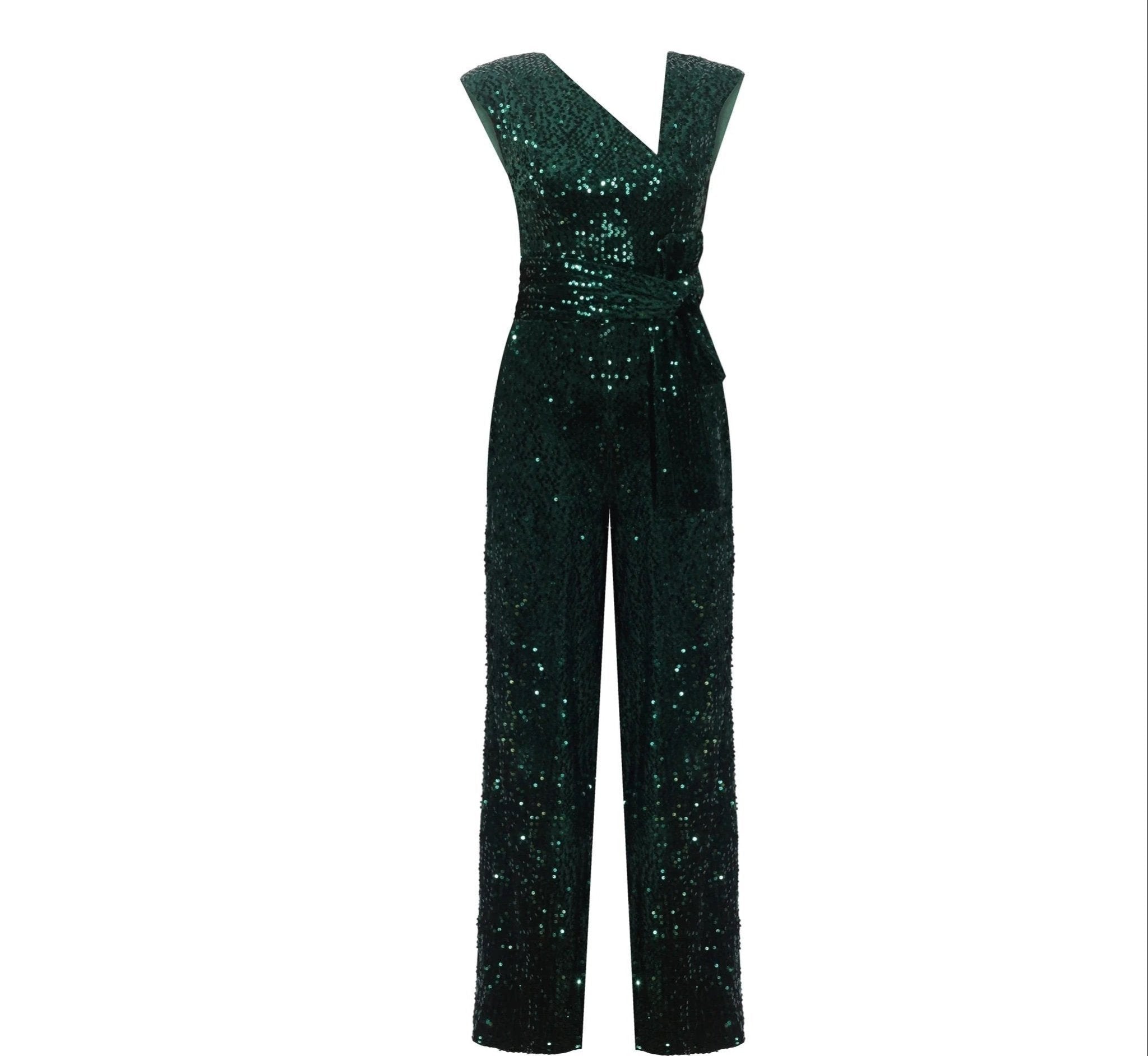 Green Velvet Sequin Jumpsuit with Satin Lining and Detachable Belt