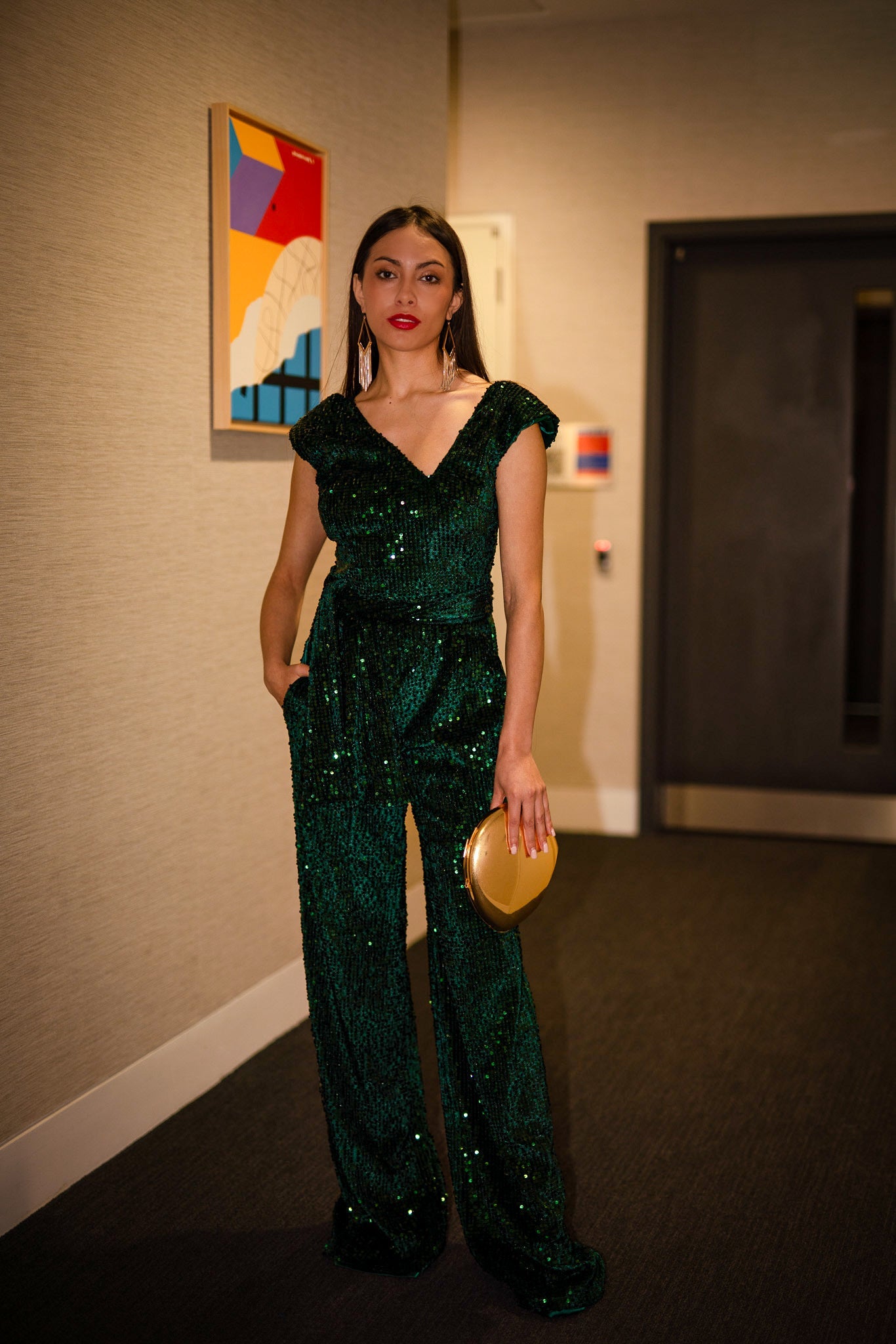 Make an unforgettable entrance in our Velvet Sequin Jumpsuit. Featuring dazzling sequins on a rich velvet base and luxurious silk satin lining, this statement piece combines glamour with comfort.