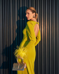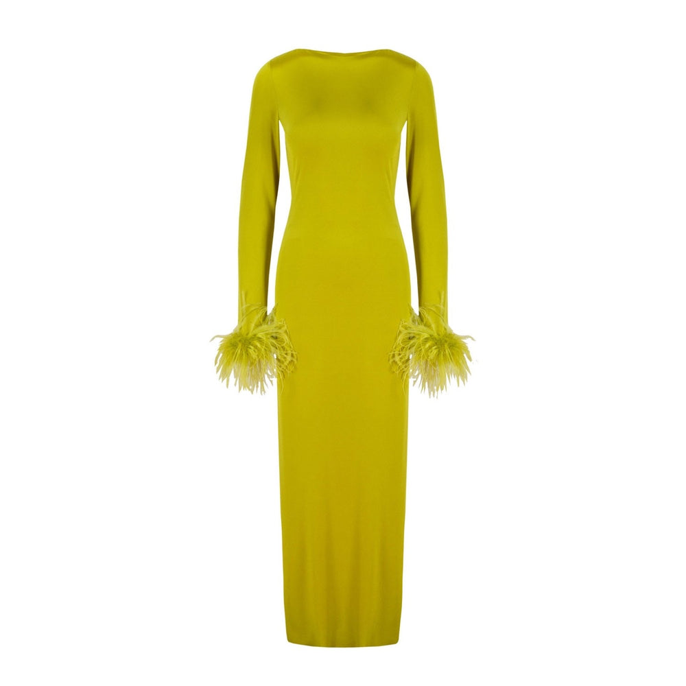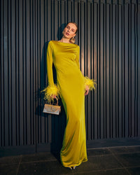 Lime Green Silk Satin Backless Dress With Feather Trim