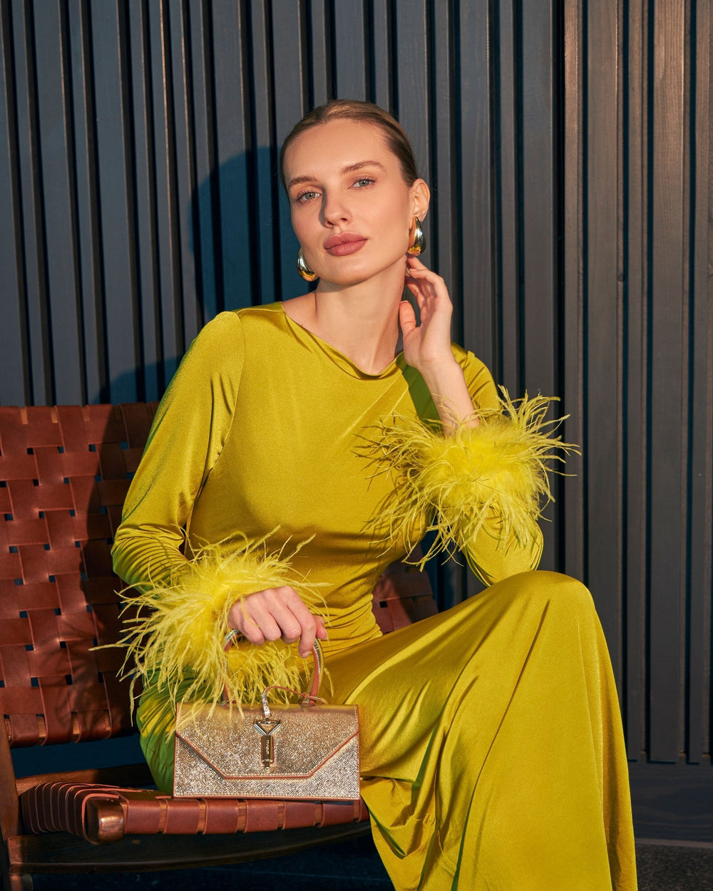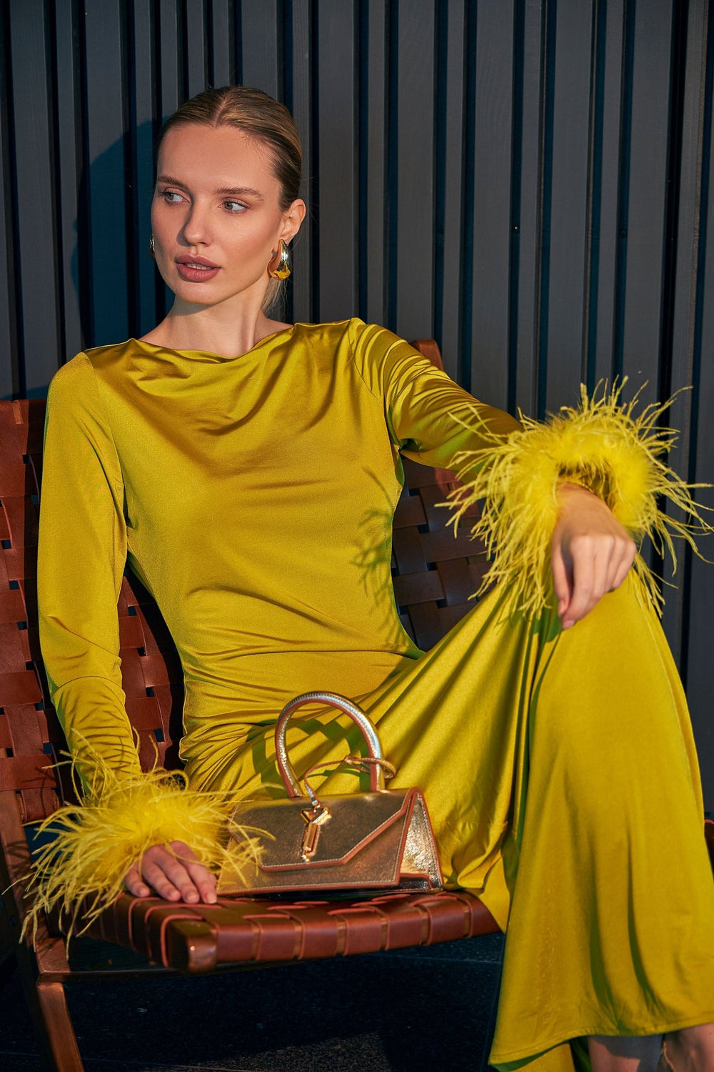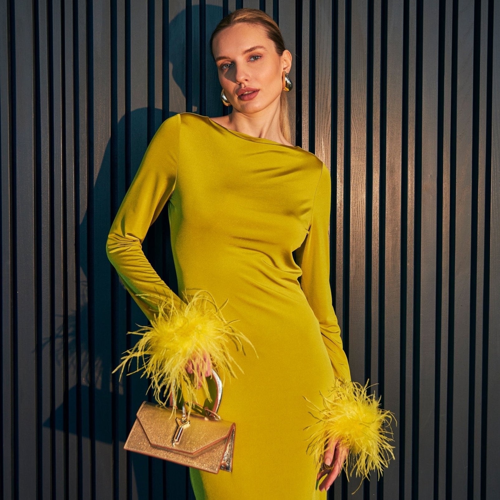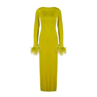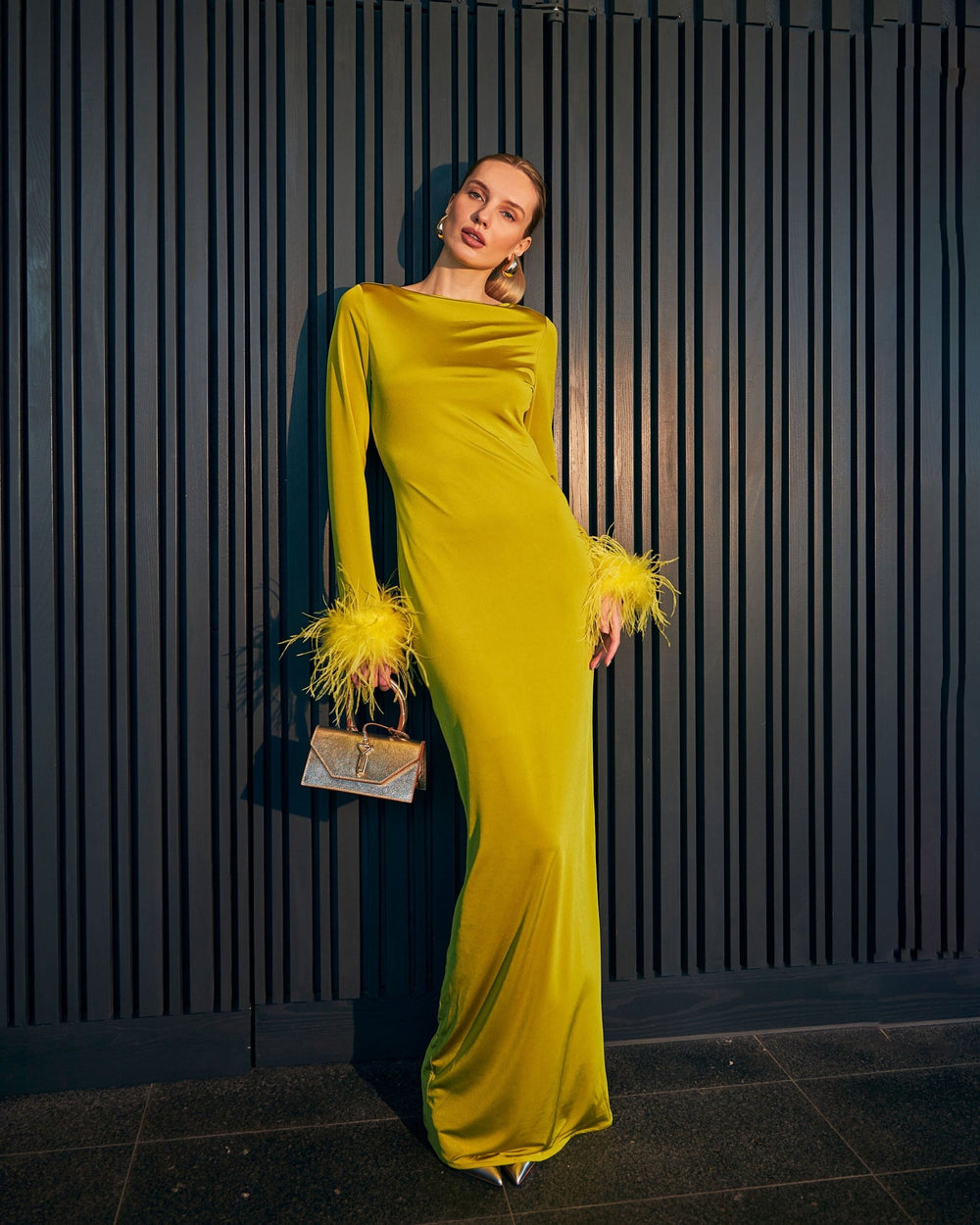 Make an unforgettable entrance in our Lime Green Feather-Trim Maxi Dress, a statement piece crafted for sophistication and style. This dress combines elegant design with modern flair, perfect for high-profile events, galas, or special occasions.