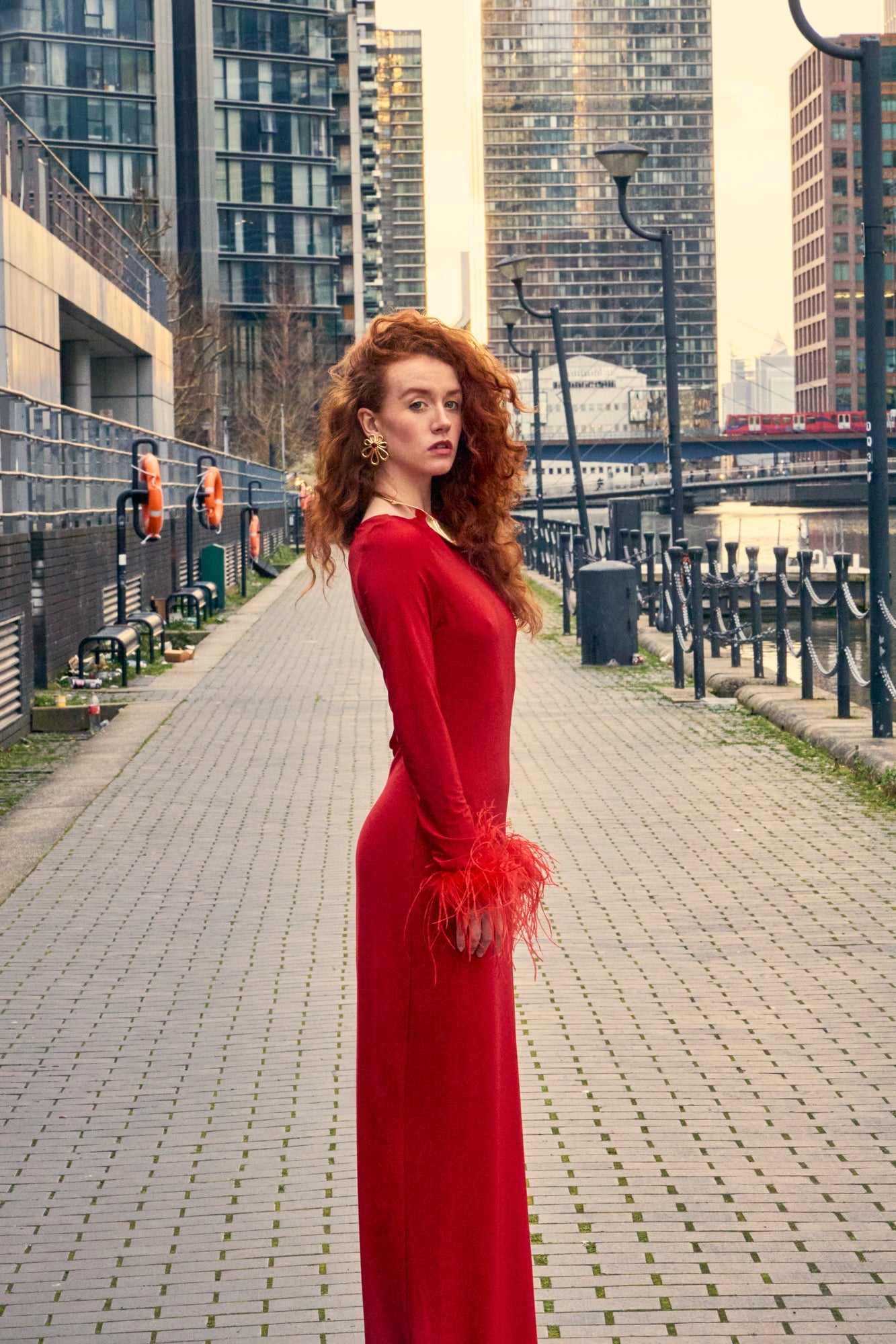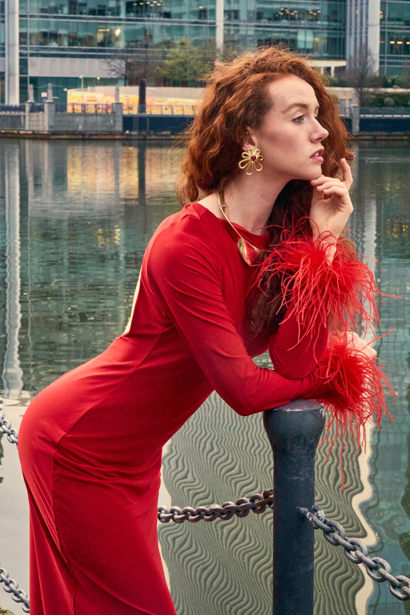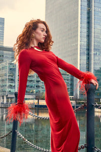 This exquisite piece boasts a sleek red silhouette, tailored to accentuate your figure with a form-fitting bodycon design. The gown features a high neckline and full-length sleeves, which gracefully transition into extravagant feathered cuffs, adding a touch of opulent drama. The rear of the dress surprises with a tasteful open back, offering a hint of allure while maintaining sophisticated coverage.