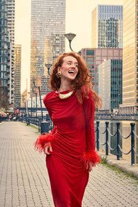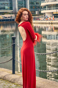 Scarlett Red Silk Satin Backless Dress With Feather Trim