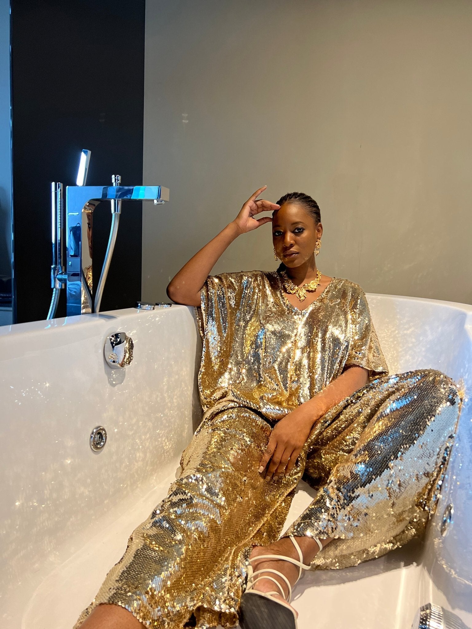 Turn heads and eyes with this luxurious gold sequin jumpsuit